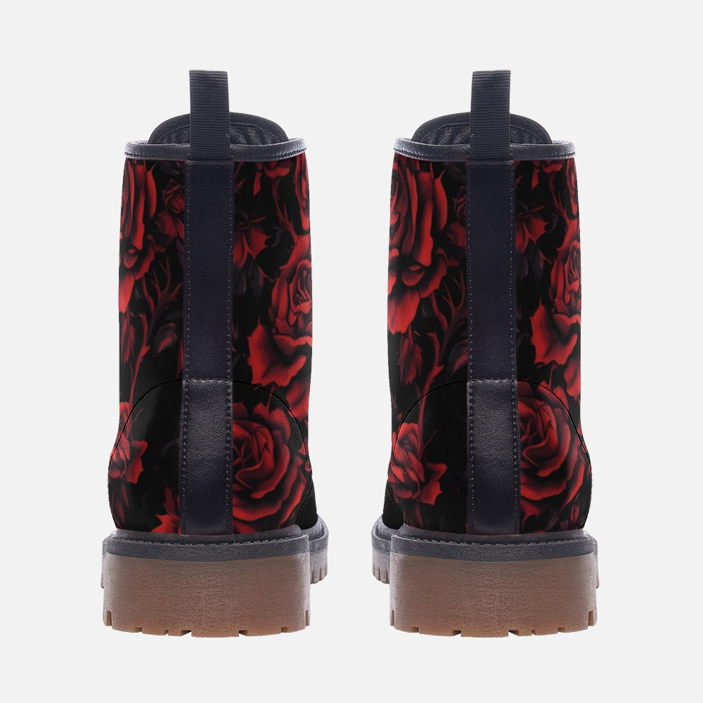 Step into a world of dark romance with our Red Rose Combat Boots. These boots are a powerful fusion of classic punk rebellion and the timeless, passionate beauty of the red rose. The design features a sleek, solid black vegan leather base, creating a stark and stunning canvas for the side panels, which burst into bloom with vivid, deep red roses. Each flower is rendered with dramatic detail, offering a captivating dark floral aesthetic that is both vintage-inspired and fiercely contemporary. Perfect for the modern goth, punk rocker, or anyone who finds beauty in the shadows, these boots are crafted for durability and comfort. Command attention with every step.