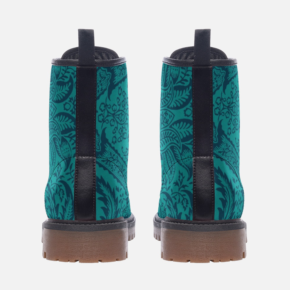 Crafted from premium, supple vegan leather, these boots are made for walking, dancing, and exploring. The classic combat boot structure provides comfort and durability, featuring a robust, non-slip sole for confident strides and classic black lacing for a secure fit. The black trim beautifully frames the artistic pattern, making the teal color pop with even more vibrancy.